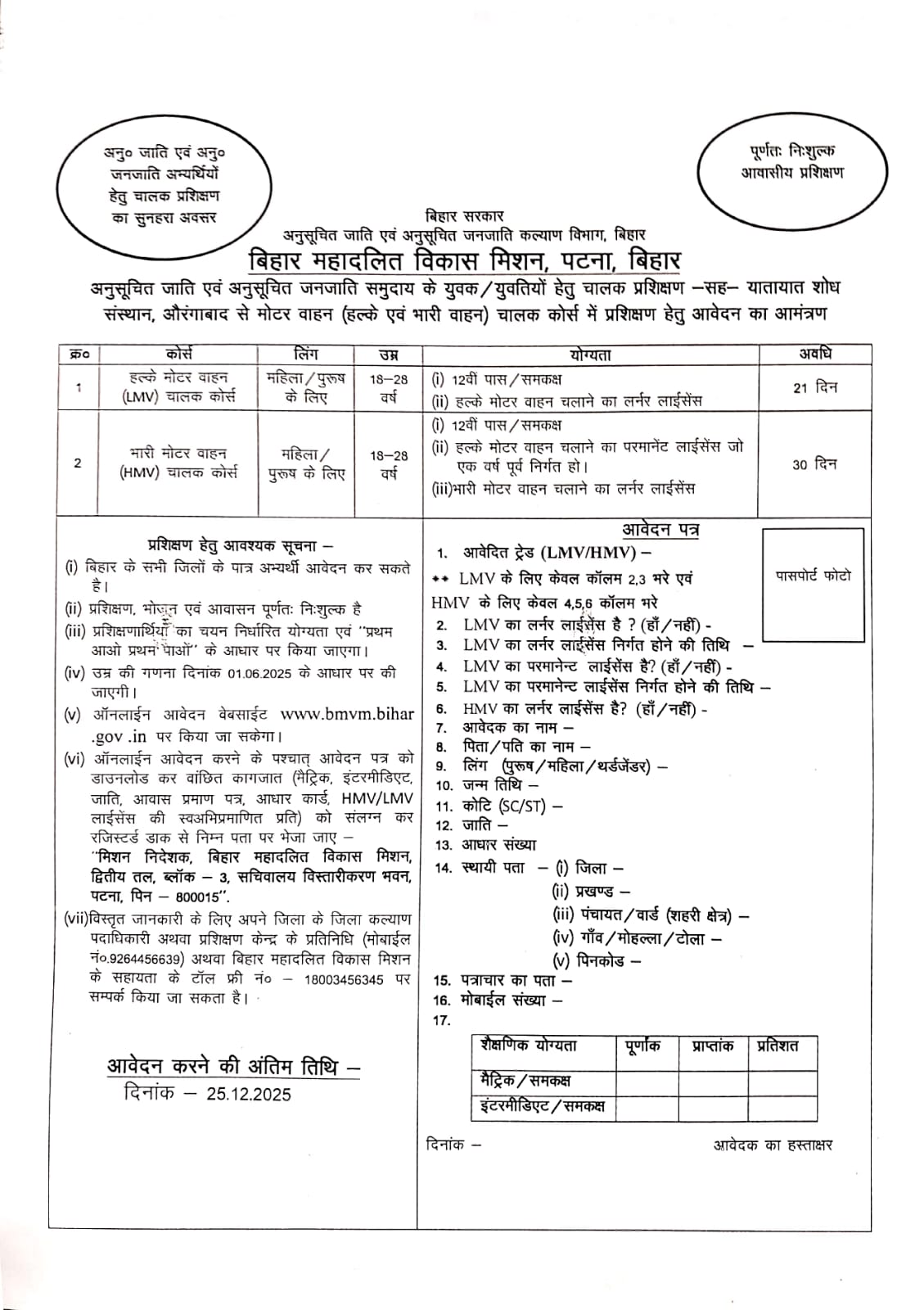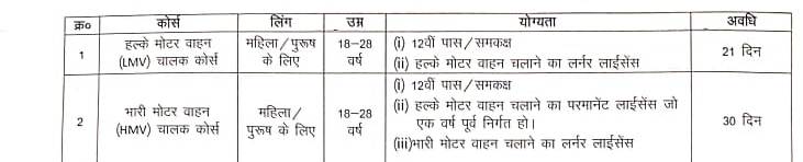 हल्के/भारी मोटर वाहन चालक प्रशिक्षण हेतु आवेदन पत्र