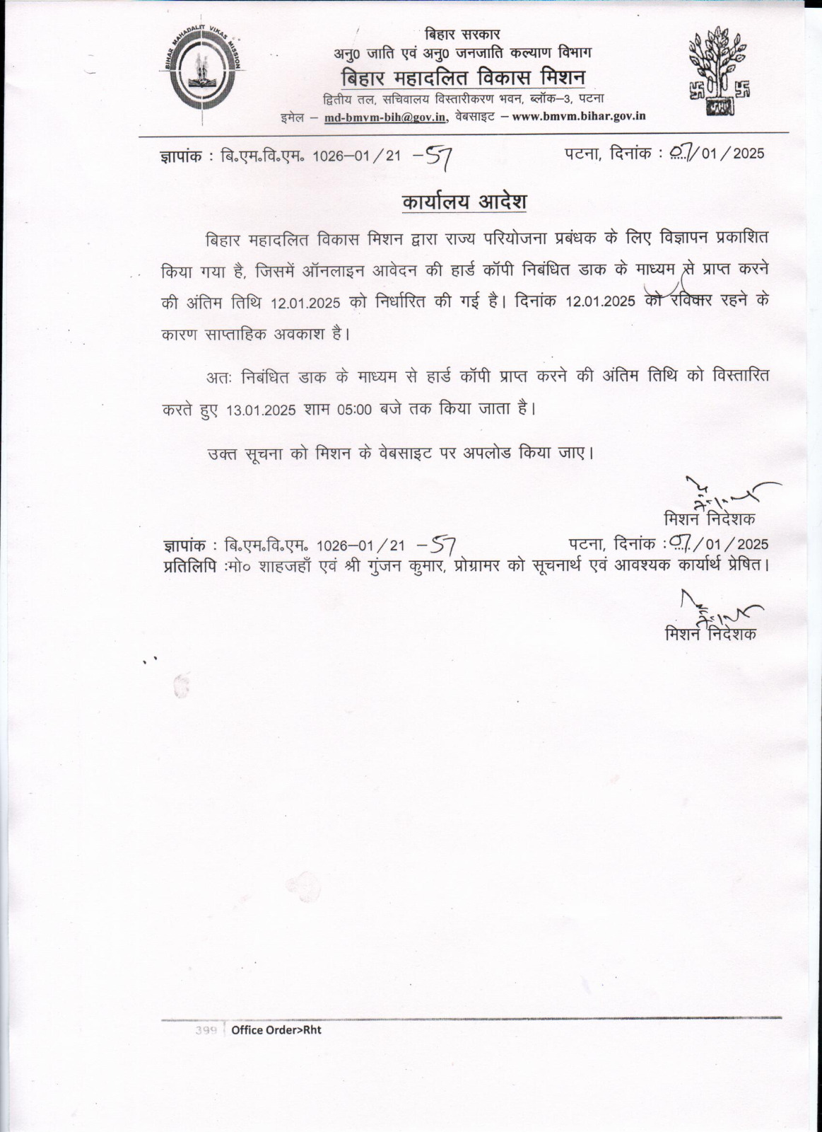 बिहार महादलित विकास मिशन के द्वारा राज्य परियोजना प्रबंधक के विभिन्न दो पदों (GA & PI) पर नियोजन हेतु विज्ञापन प्रकाशित किया गया था। निर्धारित तिथि के अंदर प्राप्त आवेदनों की हार्ड कॉपी के स्क्रूटनी उपरांत आवेदकों की सूची बिहार महादलित विकास मिशन के वेबसाइट पर अपलोड करते हुए दिनांक 16.10.2025 तक आपत्ति की मांग की गई।